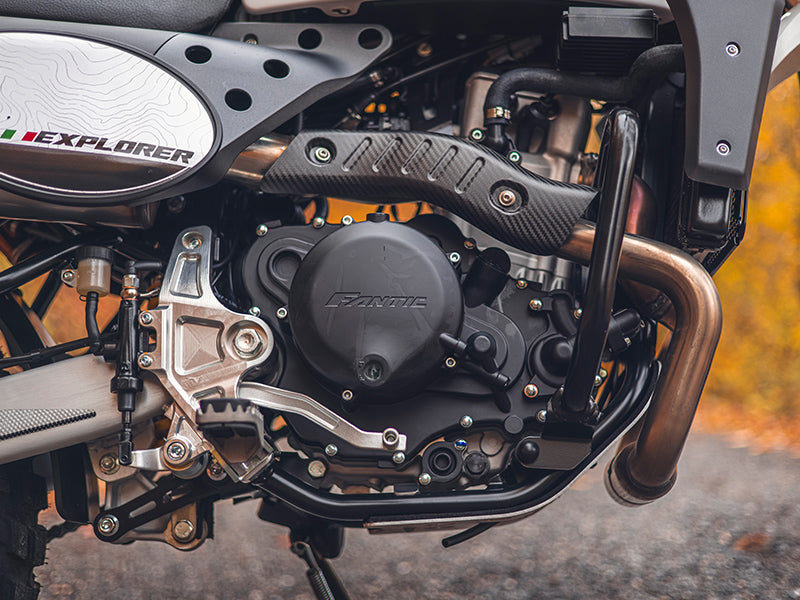 Caballero Rally 500 is the most off-road oriented model of the family. The Caballero range features a Chrome-molybdenum steel central-tube frame. This technical choice favours lightness once again, ensuring incredible agility and comfort. The front forks are a 43mm upside-down FANTIC FRS, adjustable in compression and preload; the rear suspension is also the adjustable FANTIC FRS. The spoked 19" front and 17" rear wheels give it a real scrambler look, enhanced further with the fitting of Michelin Anakee Wild knobby tyres. The 320mm front and 230mm rear wave brake disc and dis-engageable Continental dual-channel ABS guarantee great safety in every situation.