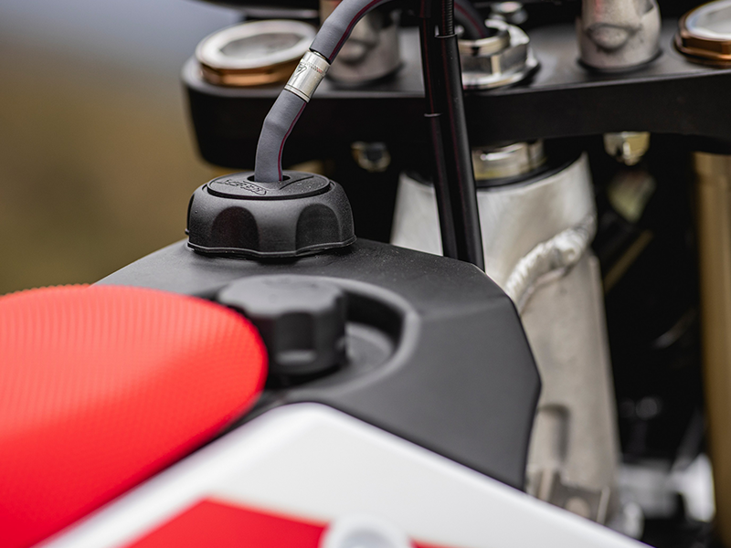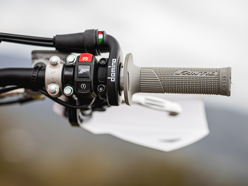 The explosiveness of the 2-stroke is also managed by the first-rate electronic component, primarily the multilevel traction control, perfect for tackling different conditions and a cutting-edge double handlebar mapping switch. Deep study was also reserved for the handlebar positions of the switches and buttons, allowing great functionality, with reduced spaces and minimal design. Configuration LEDs, multilevel Traction control setting and double map switch are positioned on the left, with only the classic kill switch on the right.
