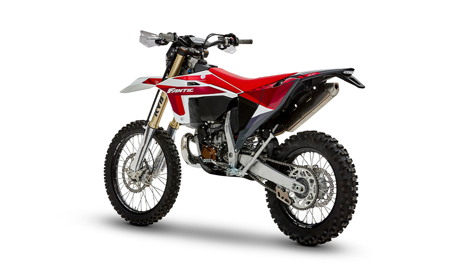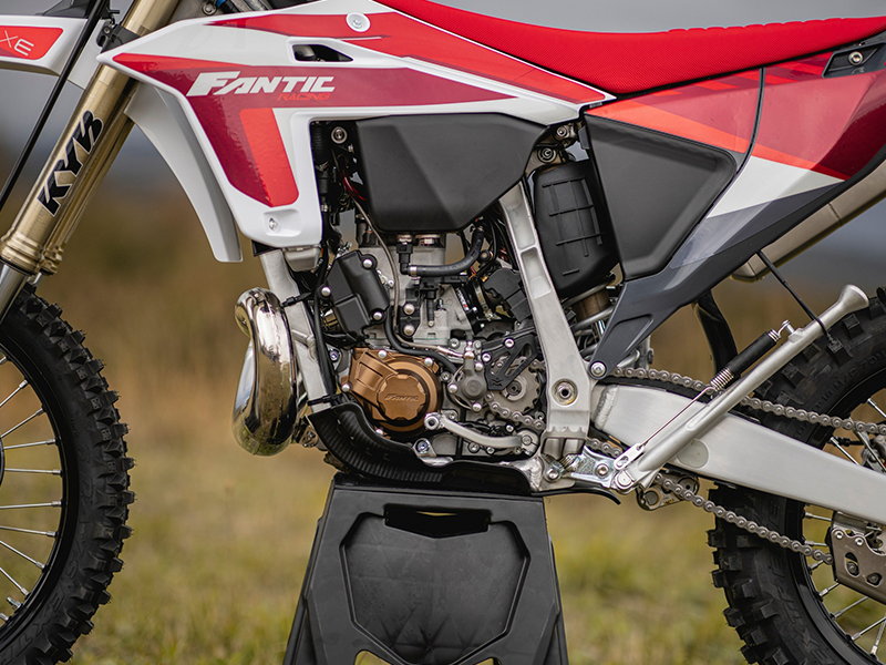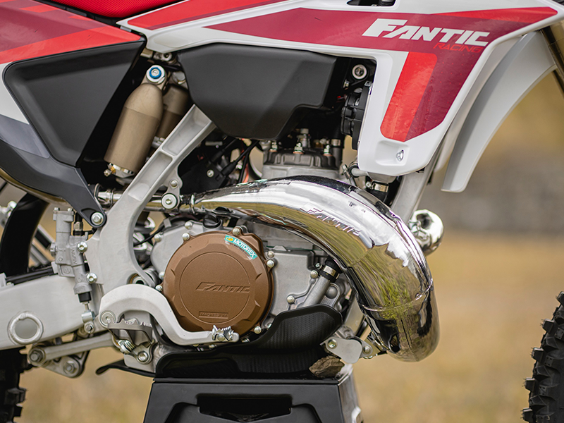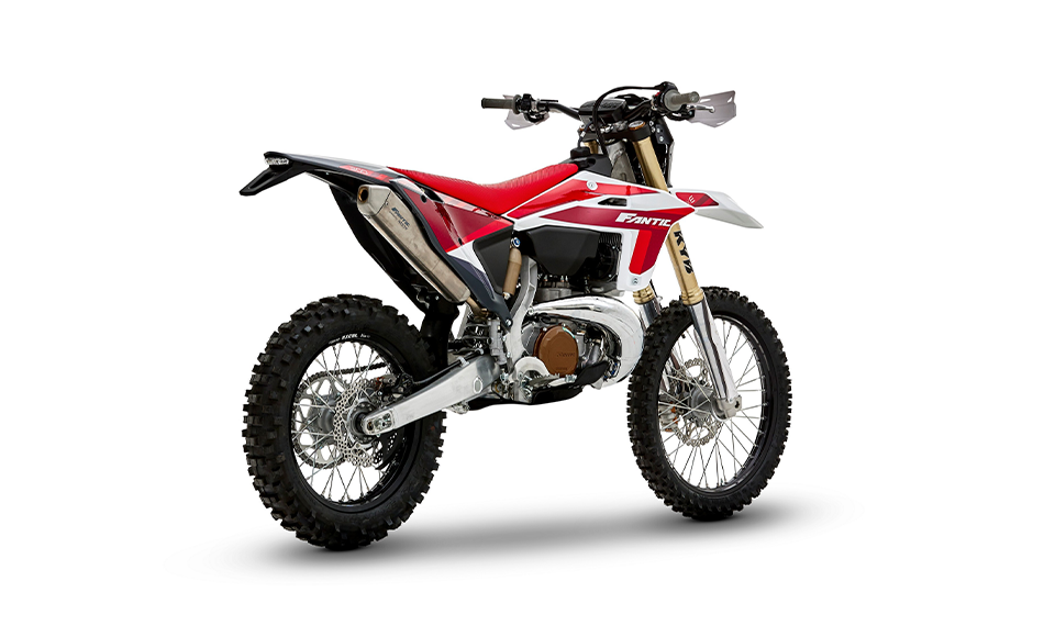 Great functionality is also guaranteed from a maintenance point of view with direct access to the air filter. Last but not least, is the ergonomic aspect studied by the Fantic test team, which boasts minimal dimensions and maximum centralization of masses. The oil and petrol tank are integrated, the conveyors are narrow and ergonomic; the rear axle has been completely redesigned compared to Fantic's other 2-stroke offroad models, ensuring room for many more components, but maintaining the same overall dimensions.