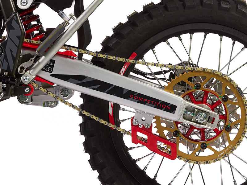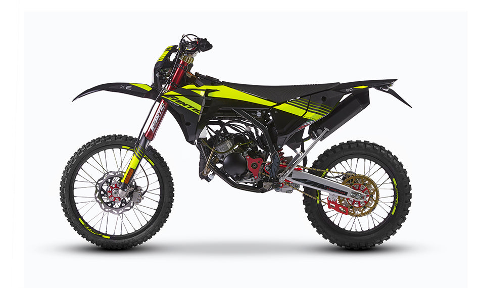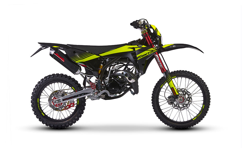 The Enduro XE 50 Competition is the bike for those who want a technical off-road vehicle, with components similar to the Racing models. The Competition set-up features 41mm Fantic FRS Red fork, FRS rear piggy back suspension, spring preload and hydraulic rebound adjustment, aluminium swingarm, anodized rear brake pump protection, CNC plates, racing braking system with adjustable reach, black anodized silencer, handguards, and a lightened crown made of Ergal alloy.