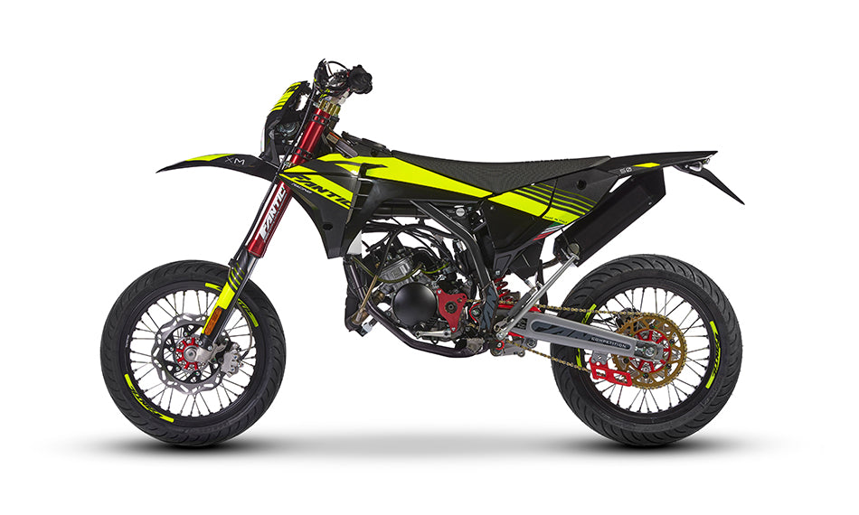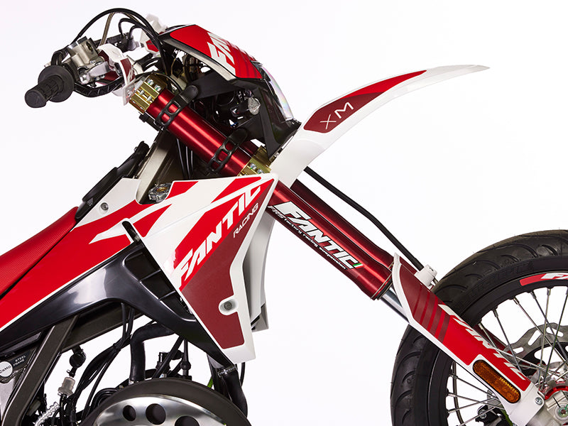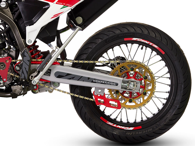 The XM 50 Competition motard is the bike for those who want more, with components similar to Racing models. The “Competition” set-up includes 41mm Fantic FRS Red fork, FRS rear suspension with piggy back, spring preload and rebound hydraulics adjustment, anodized rear brake master cylinder protection, CNC plates, racing braking system with adjustable reach, black anodized silencer, hand guards, lightened crown made of ergal.